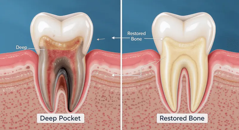 “The bone that holds the tooth in place is often damaged by disease and infection, resulting in deformity of the jaw,” explains current periodontal research. Without intervention, these deep pockets become impossible to clean effectively, allowing the infection to progress unchecked.