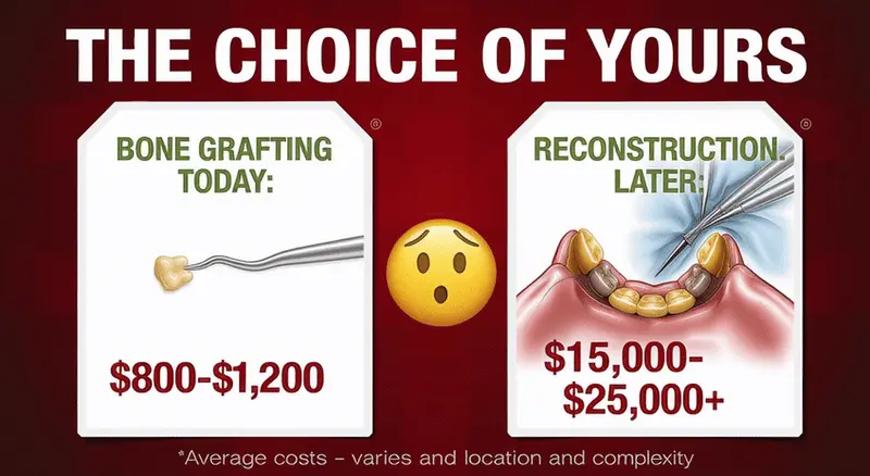 What could have been a straightforward $3,000-$5,000 implant procedure now requires extensive bone reconstruction that can cost $15,000-$25,000 or more. Some patients need bone harvested from their hip or shin—major surgeries with significant recovery times and risks.