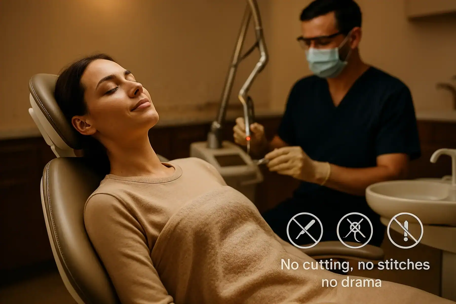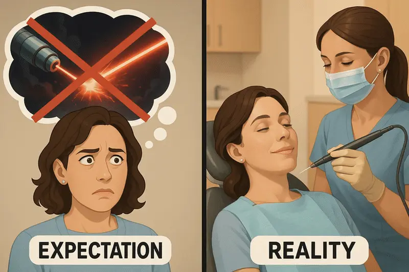 During treatment, you probably won’t feel much of anything thanks to the numbing. Some patients report feeling slight pressure or warmth, but nothing uncomfortable. There’s no cutting, no stitches, and surprisingly little bleeding compared to traditional gum surgery.